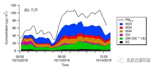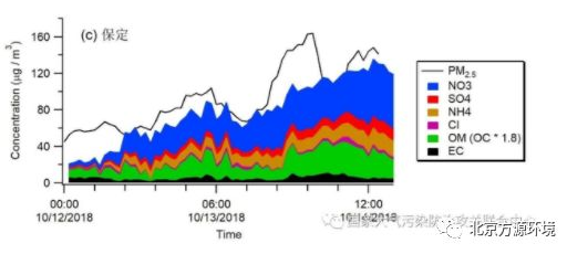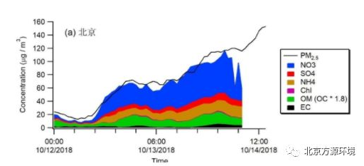同時從顆粒物組分特徵來看,本次污染過程中硝酸鹽仍為北京市PM2.5主要組分,而硫酸鹽、銨鹽和有機碳組分也不容忽視。北京市PM2.5濃度從12日中午12時開始持續升高,硝酸鹽濃度增長趨勢與PM2.5濃度增長趨勢一致,13日5時起硝酸鹽在PM2.5中的質量佔比超過40%,同期在天津、保定等城市也觀測到類似特徵。表明在靜穩高濕的不利氣象條件下,機動車和工業排放的NOx快速轉化成硝酸鹽是推高PM2.5濃度的重要原因。13日午後,硫酸鹽和銨鹽濃度再次升高,可能與東南方向傳輸的SO2和NH3有關。