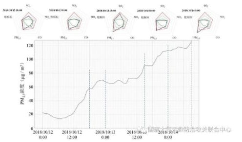 北京市PM2.5濃度在12日午後至13日凌晨、13日下午至14日出現兩次快速增長,顺利获得污染特徵雷達圖分析,12日午後雷達圖中PM2.5特徵明顯,指示氣態污染物的二次轉化是PM2.5快速增長的重要原因;13日凌晨至上午PM2.5濃度變化不明顯,與區域氣象條件轉好有關;13日下午雷達圖中SO2和PM2.5特徵明顯,考慮到北京地區燃煤污染已得到有效控制,這一特徵指示區域傳輸SO2和氣態污染物的二次轉化是本次北京市PM2.5快速增長的重要原因。