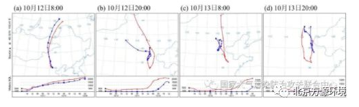圖5 北京市(a)10月12日8時、(b)10月12日20時、(c)10月13日8時、(d)10月13日20時72小時後向軌跡(註:藍線為近地面,紅線為500米高空)
